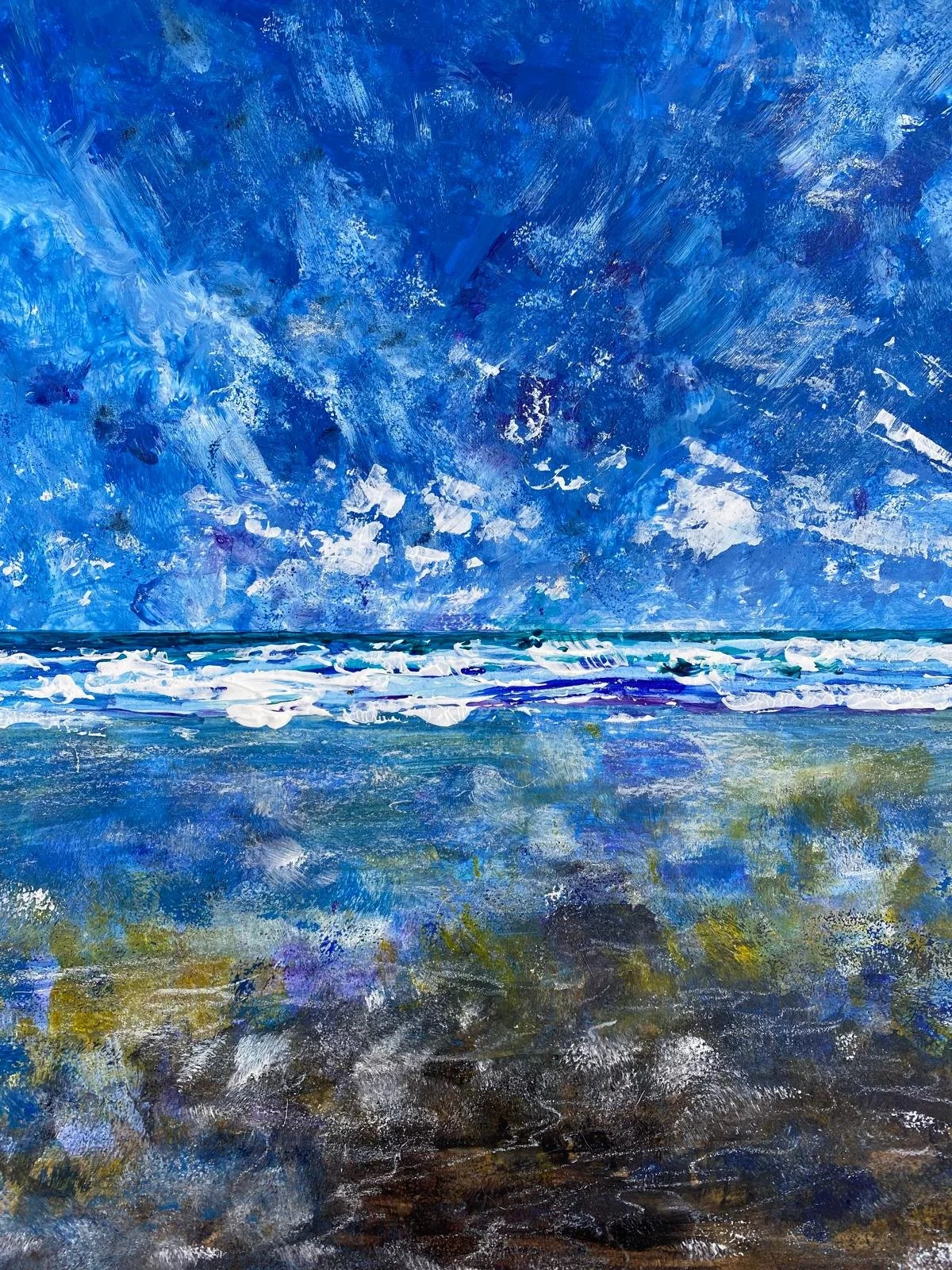 Her medium of choice is acrylic but anything can be brought into her mixed media paintings as the mood takes her and as the subjects reveal themselves.